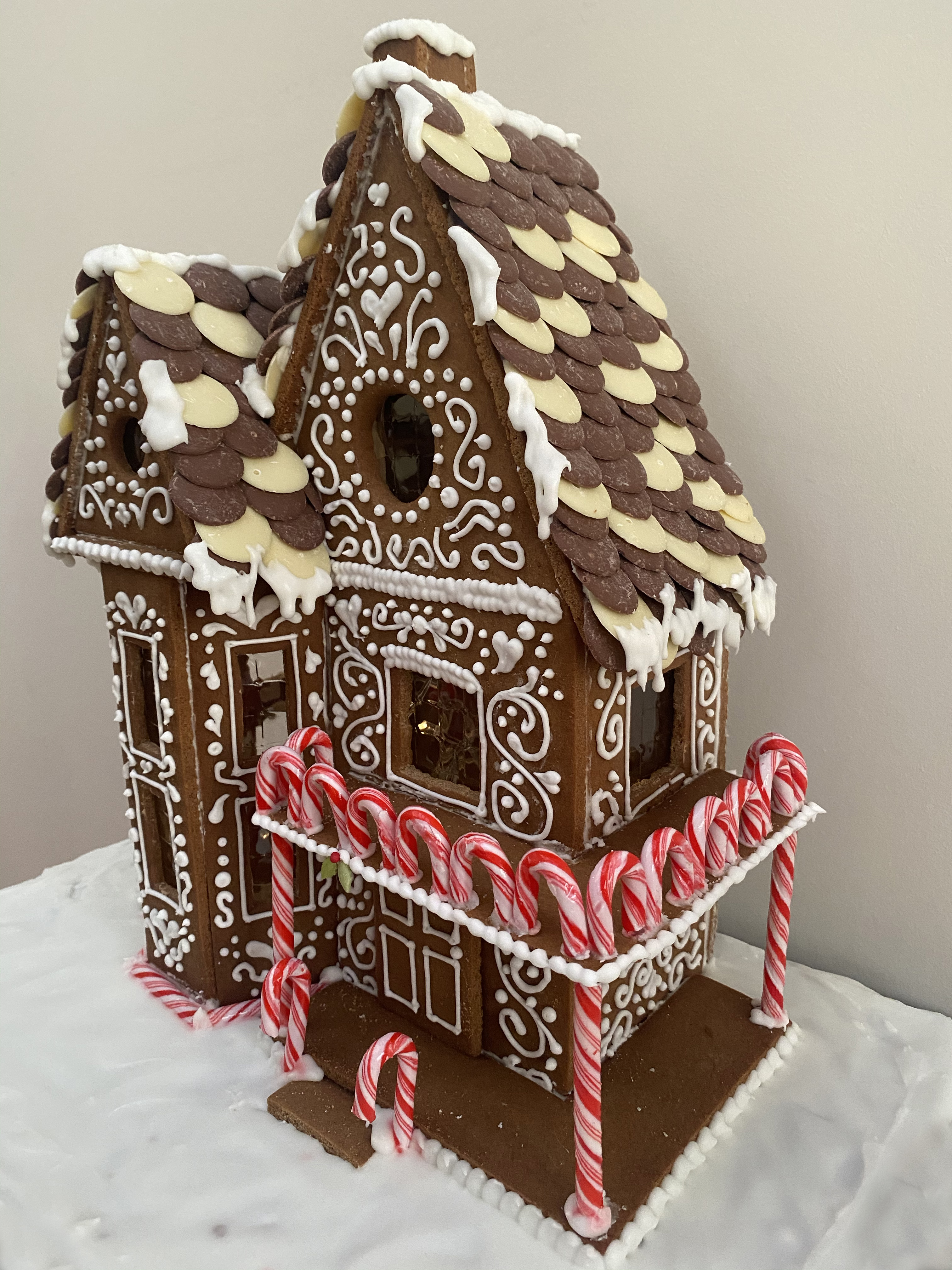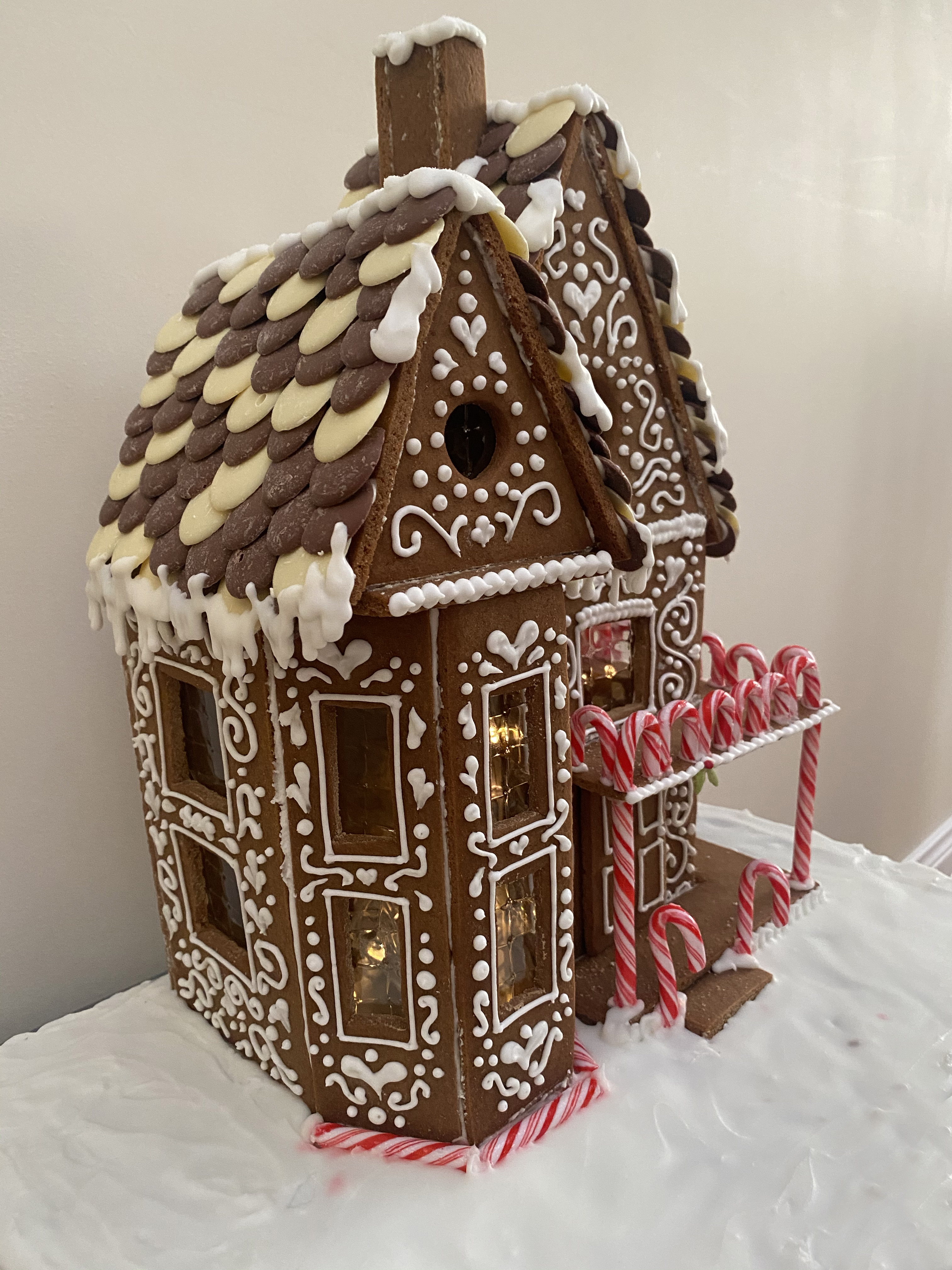 To build, I used royal icing on a chopping board. I first but up the walls, then left it to set overnight before attaching the roof. Then added all the external decoration pieces & candy canes. PSA: Candy canes are very hard to saw without shattering… I used chocolate buttons to tile the roof – this can only be done once the roof gingerbread pieces are fully set. I added a few icicle details & then filled in the board with royal icing (I had to make a second, slightly thinner batch to do this).